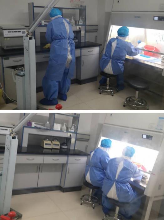 目前新型冠状病毒核酸检测实验室各项工作在有序进行,每天接到送检标本时,罗宝宏和韩玥两位工作人员第一时间穿好防护装备进入实验室开展工作。做一次核酸检测,整个实验过程需要六至七个小时。穿着厚重的防护装置连续工作,需要消耗很大体力。每次实验结束,两位实验人员都是汗流浃背,脸上被防护口罩勒出一道道痕迹,但是他们从来不抱怨,不喊累。他们严格按照实验流程,认真做好每一步,确保每一份结果准确无误。