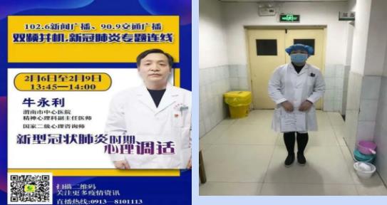 不辞劳苦,不断努力,做心理疏导的宣传者。只有心理健康,才能坚定信心。2月3日,习近平总书记强调,“要加强心理干预和疏导,有针对性的做好人文关怀。”牛永利意识到奋战在一线的医务人员面对高危高压,更需要关怀。经请示,他第一时间在医院网络平台上为医务人员进行心理知识科普、危机应对和压力疏导。接下来几天他连续作战,在渭南广播台连续录制了四期节目;参与了渭南电视台“战疫情 渭南在行动 ”抗疫—心理防护不缺席专访,为不同类别群体针对性进行了疫情期间心理应激知识普及和调适方法教授。播出期间,多人致电咨询,他都耐心听取,一一解答。