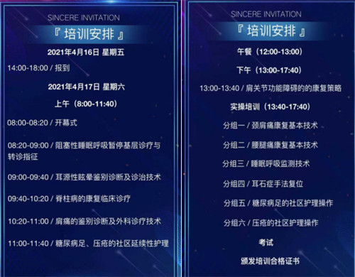 本次会议针对基层全科医务人员,进行现场实操培训,培训内容实用,易推广,考试合格者颁发培训合格证书。诚邀涉及以下疾病诊疗的相关科室医护人员参加培训:1. 脊柱病、肩痛的临床诊疗及康复技术;2. 耳源性眩晕诊治技术;3.阻塞性睡眠呼吸暂停基层诊疗与转诊指征; 4.糖尿病足及压疮的社区延续性护理。