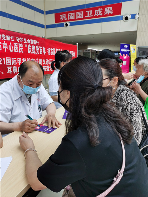 活动现场,内分泌科副主任医师丁小炼、刘莲叶、胡田颖、护士长白杨及护理团队,耳鼻喉科副主任宋建涛、主治医师赵海丽,产科主治医师王琰,药剂科党支部,肾病中医血液党支部医护人员为群众义诊,进行甲状腺防治知识科普宣传,希望大家重视健康体检,提高甲状腺疾病防治意识,谨防恶变。