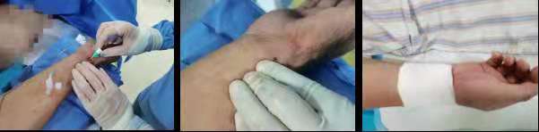 经桡动穿刺置管与股动脉入路一样,左手定位桡动脉搏动最强点,局部麻醉后,穿刺,喷血后植入导丝,沿导丝植入6F桡动脉专用血管鞘。穿刺伤口2mm,创伤小无痛苦,活动不受限。