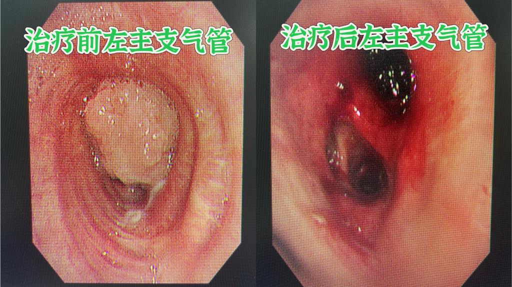 4月4日下午14:30分,在麻醉科副主任医师马建中,呼吸内镜副主任医师吴水淼、主管护师薛冬冬及呼吸内镜团队的共同协作下,顺利为患者进行检查。镜下见右肺各级支气管管腔通畅,粘膜光滑,镜下未见新生物;左主末端支气管见一新生物堵塞管腔,给予圈套器、冷冻、氩气联合治疗清除新生后,见新生物来源于左肺上叶、左肺下叶支气管均通畅,达到理想效果。手术历时1小时30分,术中生命体征平稳,安返病房。