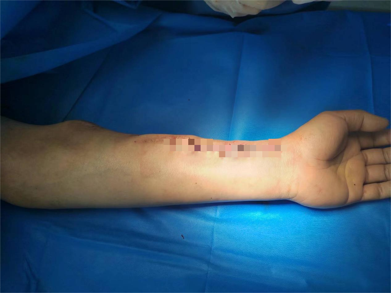 患者男性,41岁,慢性肾脏病5期,血液透析3年。左前臂内瘘近吻合口处因外伤后致瘤样扩张并感染1月,直径约4.6cm,术前瘤体已感染并已濒临破裂,随时有生命危险。