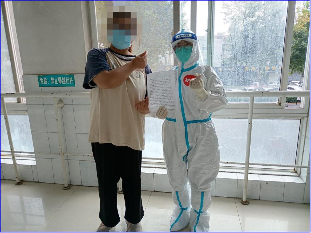 期间我还收获很多感动。有一次,我在病房里为患者进行消杀工作时,一位大爷跟一位奶奶在一旁聊天:“这些娃们不容易啊!他们真辛苦!我们可得抓紧好起来,不能给人家添麻烦。”听到这,一股暖流涌上心头。就在9号,我一直照顾的小姑娘终于出院,她为我们留下一封感谢信。看了这封信我瞬间泪目,原来医护人员的付出病患都看在眼里、记在心里。他们对我们的理解、认可、感恩,更加坚定我与病毒对抗的决心。