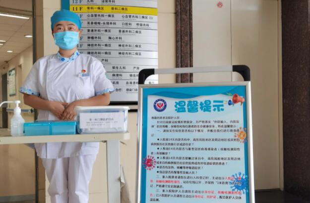 加强门禁管理。科室选派业务能力强、思想站位高的护士承担门禁工作,切实做到凡入必检、凡入必登、凡入必测的原则。同时科室特制温馨提示疫情展板和语音宣教,使患者及时掌握医院及科室疫情防控相关要求,守好科室第一防线。