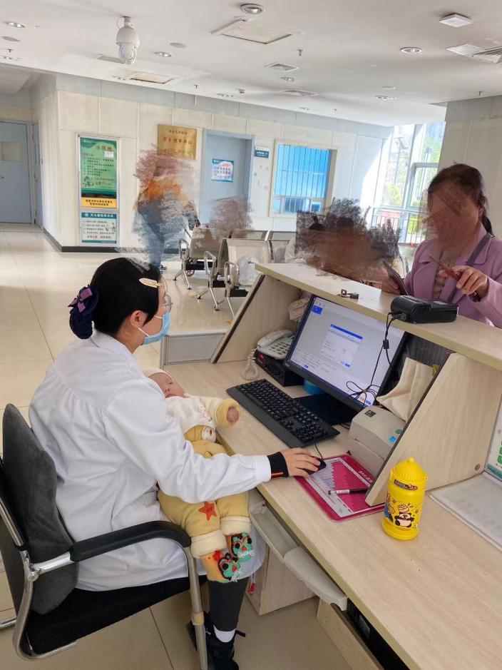下午15:10分,黄女士抱着五个多月的孩子来到儿科门诊。孩子腹泻一月余,四处就医均无明显改善,特来市中心医院儿科寻求进一步诊治。就诊后,医生为患儿开出生化检查单,需家长到门诊二楼检验科取回化验器皿。黄女士独自一人抱着孩子,如来回折返,费劲费时,多有不便。分诊护士薛琳在巡视诊区的时候,发现黄女士非常着急,面带难色,便主动上前关切地询问,是否需要帮助。当黄女士说出自己的纠结时,怀孕7个月的薛琳当即伸出双手说到:“孩子交给我,您放心快去。”一边说着,一边挺着孕肚接过孩子,毫不犹豫的承担起“护士妈妈”的角色。怀孕期间,薛琳右手患有腱鞘炎,正经受着疼痛的折磨,但她能克服疼痛,尽可能保证维持着孩子舒适的抱握姿势。随后,薛琳一手抱着孩子,还要腾出另一只手为其它前来的患儿刷卡挂号。怀里的孩子特别乖,全程不哭不闹,安静地躺在“护士妈妈”的怀抱里等待着妈妈的到来。