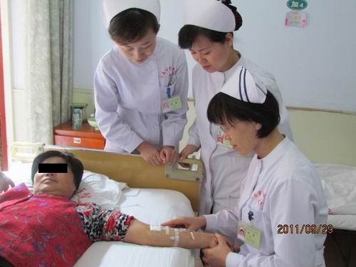 肿瘤患者治病心切,而有限的血管成为输注化疗药物的最大障碍,有的药物渗漏甚至被迫中断治疗,给患者造成巨大的心理压力。肿瘤科一病区作为我院首批优质护理示范病区,历来对此非常重视,曾派出师级以上护士到第四军医大学唐都医院相关科室轮流学习血管保护措施。多次请省静疗学会专家来科室举办讲座,现场培训“经外周中心静脉置管(PICC)”技术,并指导工作。对科内实施的近百例PICC置管技术给予高度肯定,认为:操作人员有资格证书,人员梯队合理,技术成熟,能解决疑难问题。自开展此项技术以来,再未出现化疗药物渗漏现象,获得病人的一致好评。