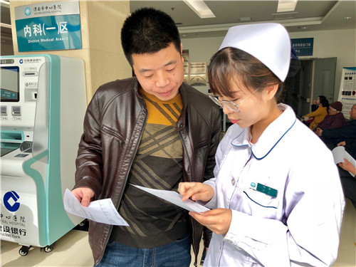 2018年9月20日,像往日一样,我整装上岗,巡视大厅。只听见办卡窗口熙熙攘攘的人流中,一位老者焦急地比划着,大声的喊着,我急忙上前询问,原来因预约信息与就诊卡信息不符,患者不能及时就诊。我询问清楚后,一边安抚老人一边联系窗口工作人员,帮助老人更正就诊卡信息,并护送至泌尿科就诊,得知需要做泌尿系膀胱B超,我主动为老人打来温开水,指导患者憋尿做检查、再留取尿标本……,并联系老人的亲属告知检查情况。