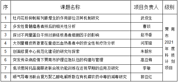 根据医院文件精神,将综合排名前8名的项目推荐为我院2021年市级科技候选项目,资助金额以市级财政拨款为准,医院按照科研管理办法给予一定比例配套资金对2021年科研项目申报及实施提出以下具体要求: