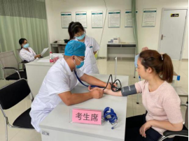 7月27日,按照医院疫情防控要求,会务人员在考生进入考场前逐一进行测体温、查验健康码,当天进行了笔试及分组技能考试。本次笔试采用手机APP在线考试,实现笔试过程方便、快捷。技能考试主要项目包含体格检查及临床基本技能,由各专业基地教学主任、主任助理担任考官。