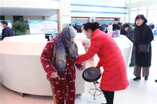 为站在导医台附近等候家属的老人递上凳子,