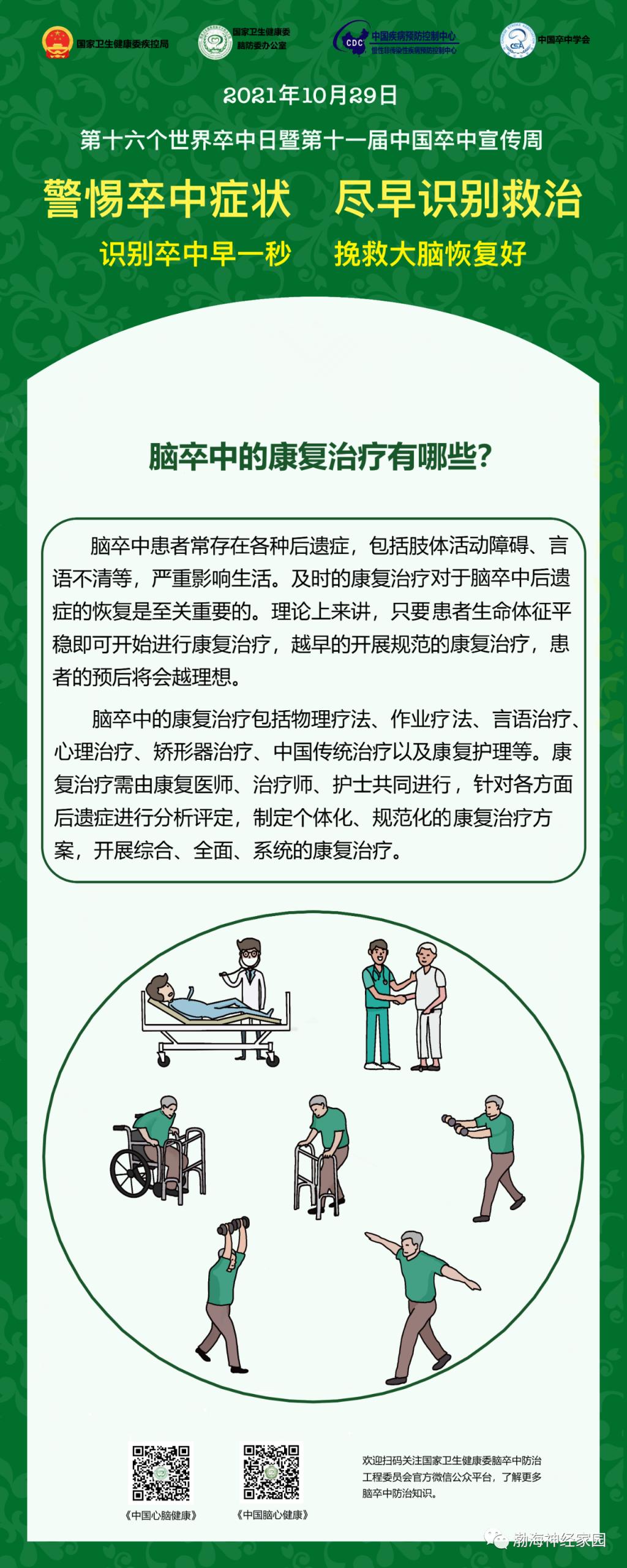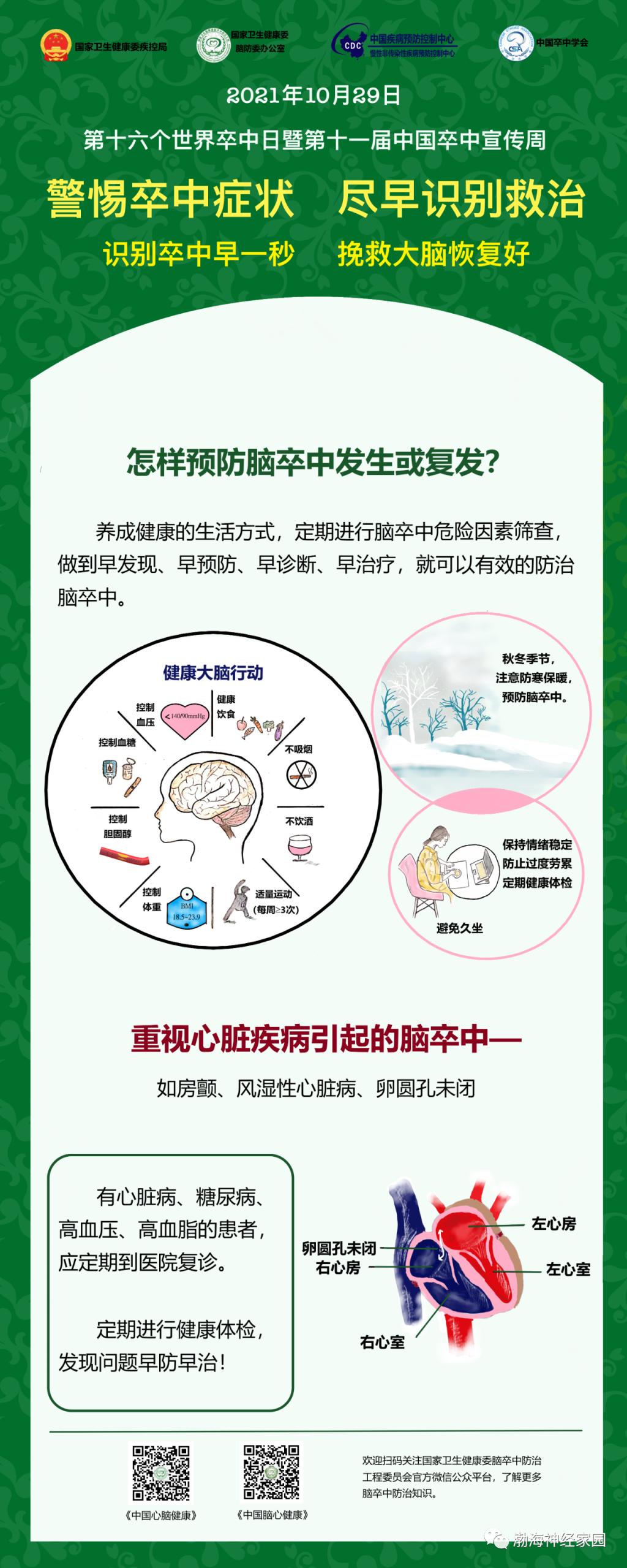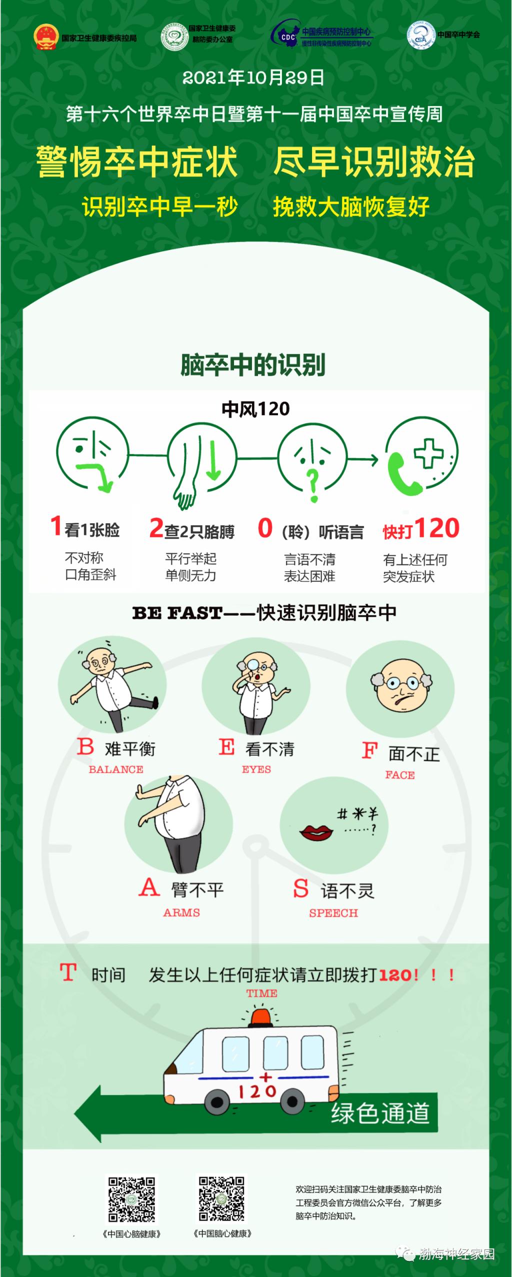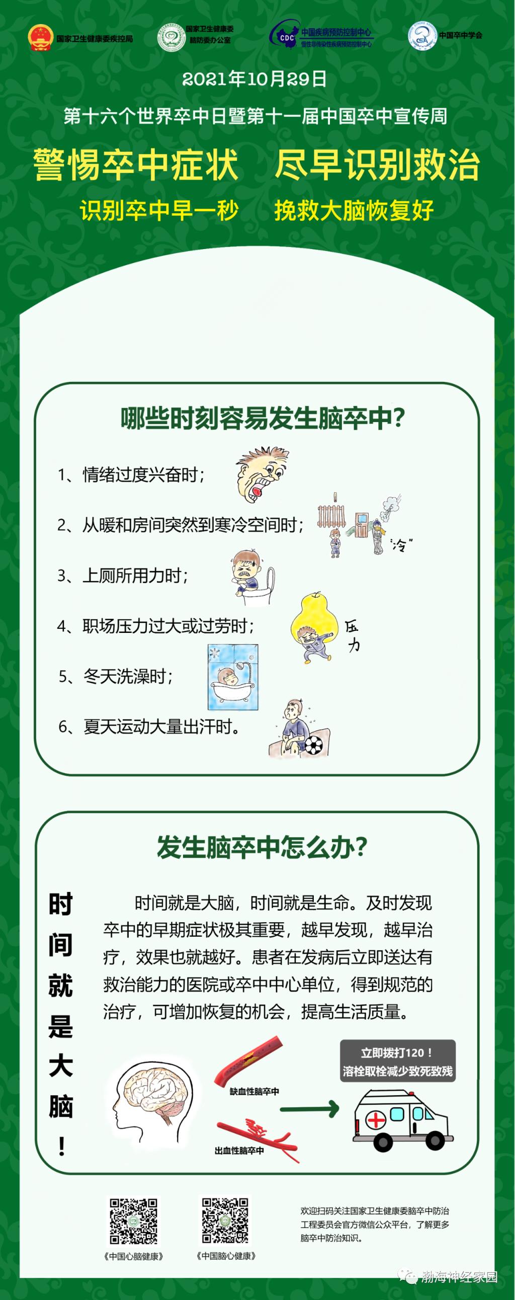 2021年10月29日是第16个“世界卒中日”。为贯彻落实《健康中国行动(2019-2030年)》《国家卫生健康委疾控局关于开展2021年慢性病系列宣传活动的通知》等文件精神,有效预防和控制脑卒中高危因素,提高群众卒中识别能力,减少因脑卒中导致的残疾、死亡发生,按照国家卫生健康委脑卒中防治工程决定组织开展“2021年世界卒中日暨第11届全国卒中宣传周系列活动”。