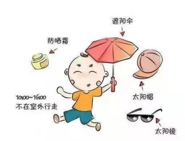 应避免长时间直接直射暴露在室外高温下,做好防晒、穿着轻薄、宽松及浅色的衣服。