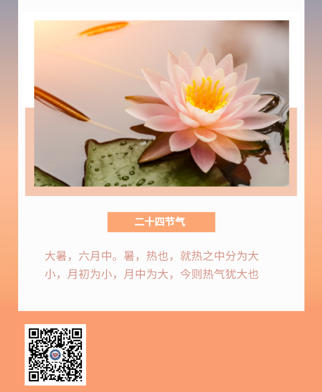 大暑是二十四节气中的第十二个节气,也是夏季最后一个节气。斗指未,太阳黄经为120°,于公历7月22日—24日交节。“暑”是炎热的意思,大暑,指炎热之极。大暑相对小暑,更加炎热,是一年中阳光最猛烈、最炎热的节气,“湿热交蒸”在此时到达顶点。大暑气候特征:高温酷热、雷暴、台风频繁。